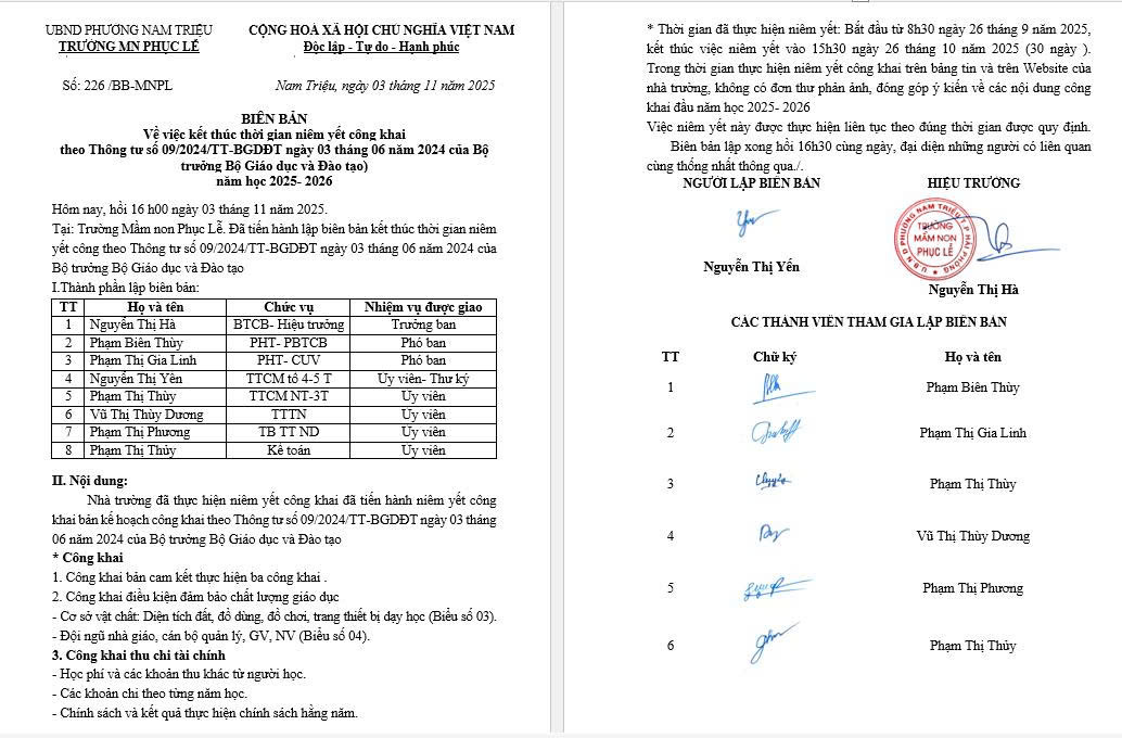 Thực hiện theo quy định tại thông tư số09/2024/TT-BGD ĐT ngày 03 tháng 06 năm 2024 của Bộ trưởng Bộ Giáo dục và Đào tạo về quy chế thực hiện công khai trong các cơ sở giáo dục, sáng nay, Trường Mầm non Phục Lễ đã tiến hành lập biên bản kết thúc việc niêm yết 03 công khai năm học 2025 – 2026 📑✨.💡 bien-ban-niem-yet-ket-thuc-3-cong-khai-1_511202516.docx